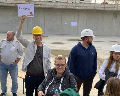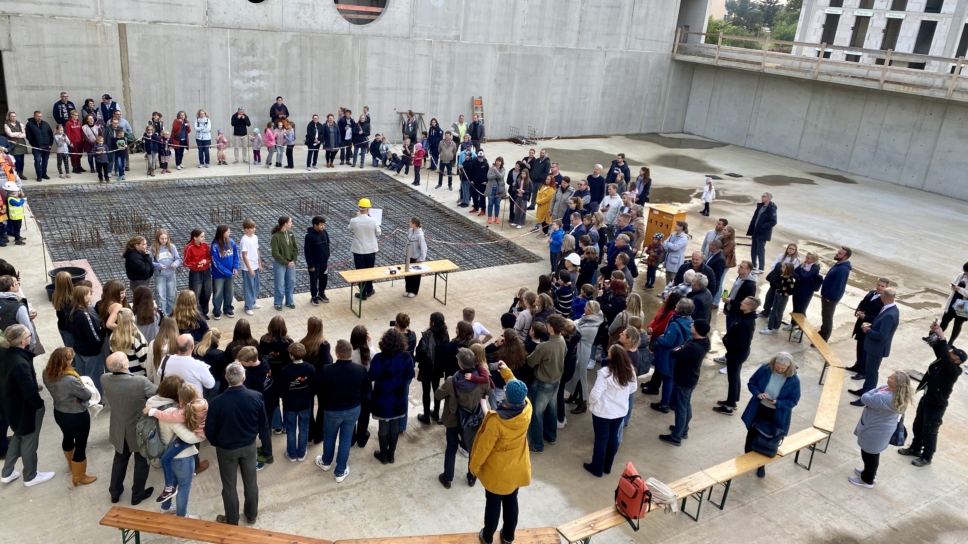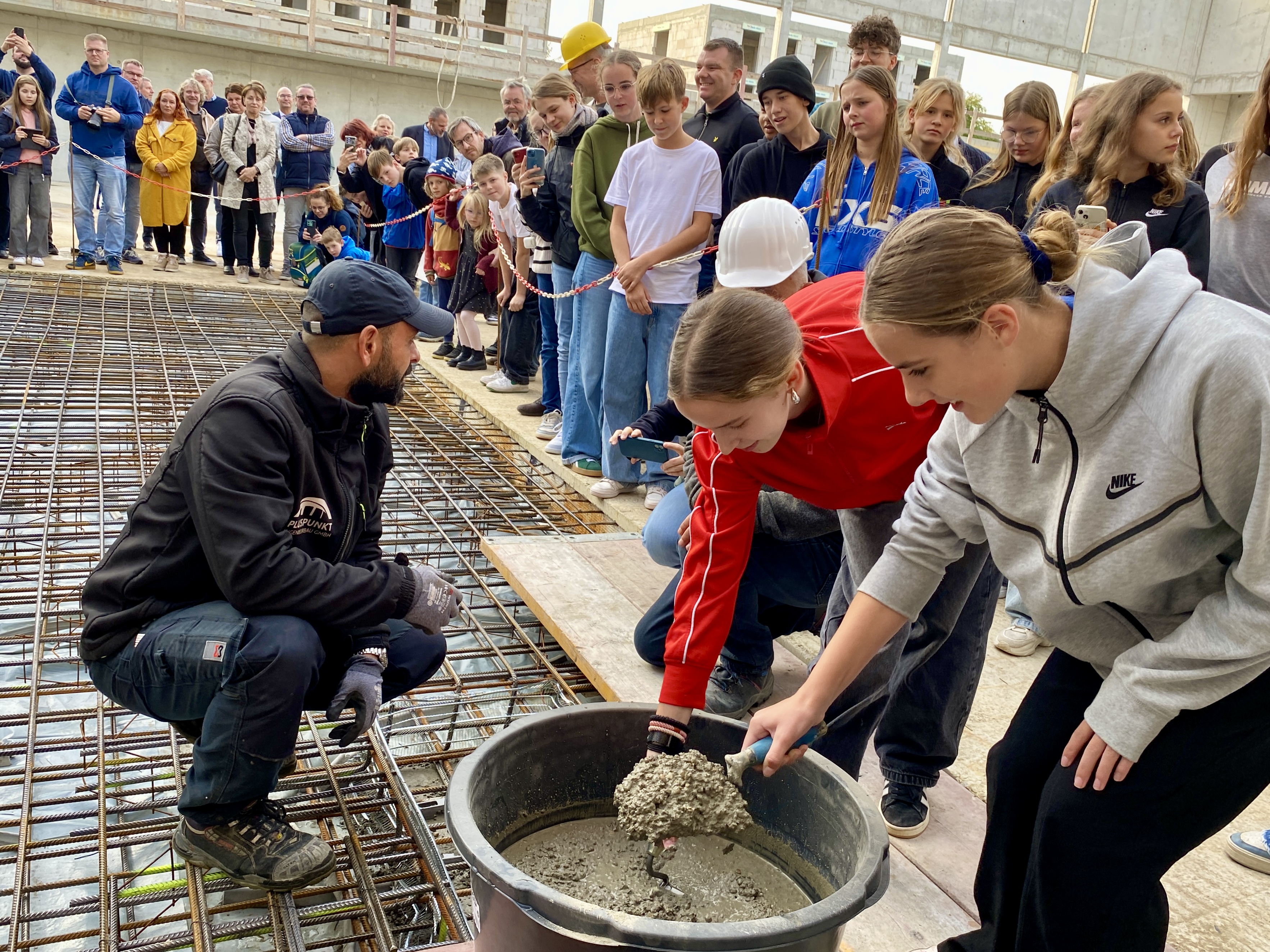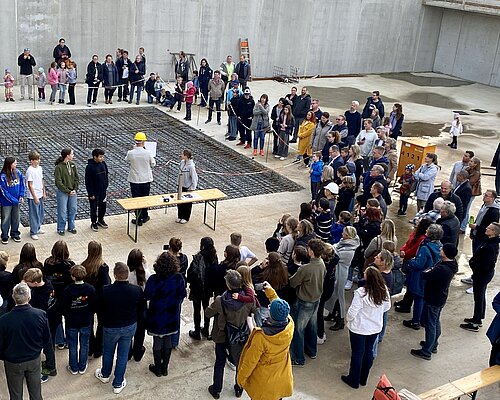 In den Boden der Sporthalle betonierten die Schüler*innen der Gesamtschule eine „Zeitkapsel“ mit Bauplänen, Fotos, Erinnerungen und einer Münze ein. Wenn die Sporthalle fertig ist, wird diese auch von lokalen Vereinen genutzt werden. Bei Rundgängen berichteten Grit Heuer und Hajo Tischer, Leitungsteam Gesamtschule, sowie Bauleiter Frank Groger und Oliver Genetzke, Leiter Zentraler Service der Hoffbauer-Stiftung über den Baufortschritt. Dabei wurden die Dimensionen des Bauprojektes konkret nachvollziehbar.