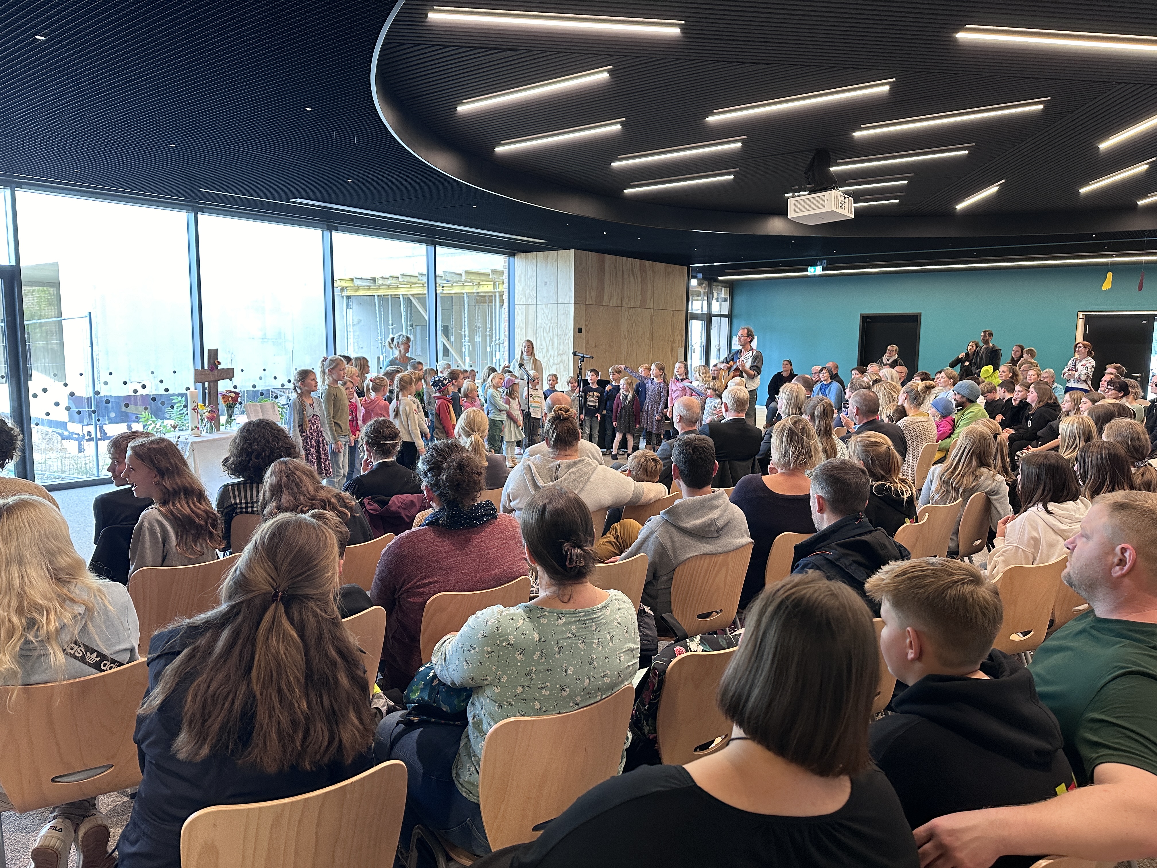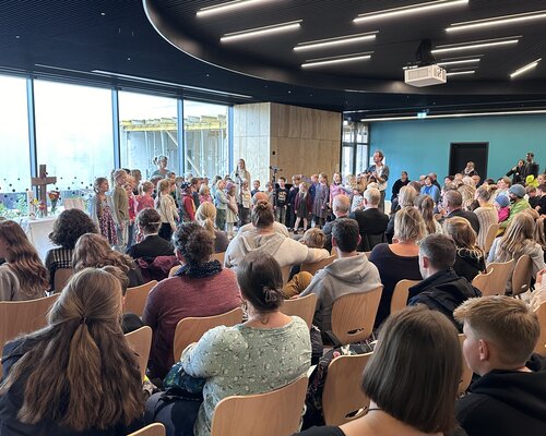 Die Kinder und Jugendlichen der Evangelischen Gesamtschule, Grundschule und Kita begrüßten die Gäste mit selbst gesungenen Liedern. Nach Grußworten von Frank Hohn, Vorstandsvorsitzender der Hoffbauer-Stiftung; Christian Große, 1. Beigeordneter der Stadt Werder und Reno Lütke, Präsident des Handballvereins Grün-Weiß Werder und einer Andacht ging es auf die Baustelle.